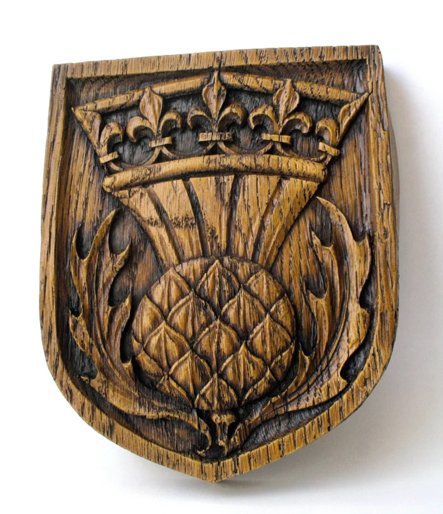 This wonderful carving of the Scottish National Emblem is found upon the main door that opens to the Thistle Chapel of St. Giles Cathedral Edinburgh. The Thistle is beautifully carved with the crown in place at the head of the plant and is set within a shield. This replica is taken from the original carving that captures all the rich and fine detail found within the original. This reproduction is designed to hang on display from a wall making a magnificent central focal point for any person with proud Scottish connections and decent. Comes with a fixture for wall hanging and product label.